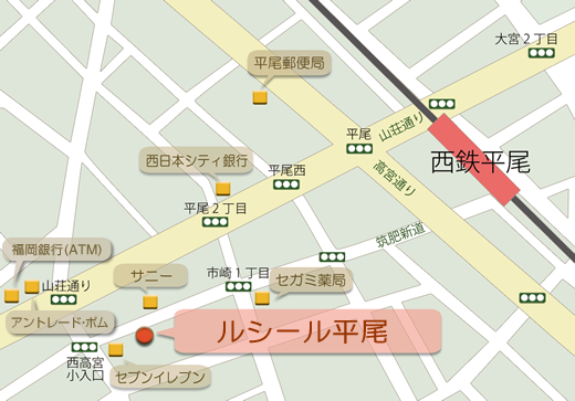 福岡銀行・西日本シティ銀行・平尾郵便局・山荘通り郵便局 |